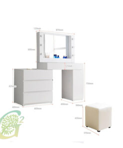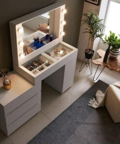 Tuy không phải là bàn trang điểm mới ra nhưng lại không bao giờ hết hot cho đến hiện nay. Với thiết kế đơn giản, có thể mở rộng hoặc hạn chế diện tích của bàn trang điểm tùy thuộc vào từng không gian, khiến cho phòng ngủ của bạn luôn mới mẻ và hiện đại với tone màu trắng phù hợp với mọi không gian. Không những thế mà hai bên được lắp 6 bóng đèn hiện, tạo không gian ấm áp và nhẹ nhàng cho không gian của bạn.