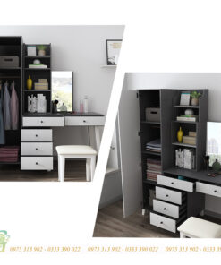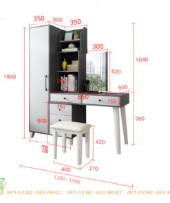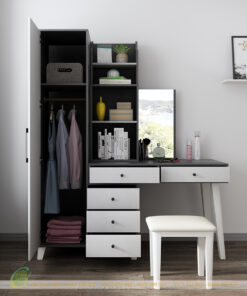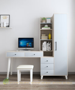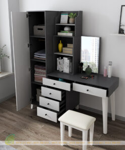 Bàn Trang Điểm Kết Hợp Tủ Áo Nhỏ MD-05 được thiết kế theo phong cách Bắc Âu kết hợp với tủ quần áo nhỏ gọn bên cạnh. Bên cạnh đó kèm kệ sách để bàn hoặc lưu trữ mỹ phẩm dành cho phái nữ, đi kèm là gương rộng 300mm. Bàn kết hợp chân gỗ tự nhiên tạo nên sự mạnh mẽ dành riêng cho phái nữ cá tính. Dưới bàn kết hợp với tủ kéo nhỏ giúp bạn lưu trữ những vật dụng cần thiết.
